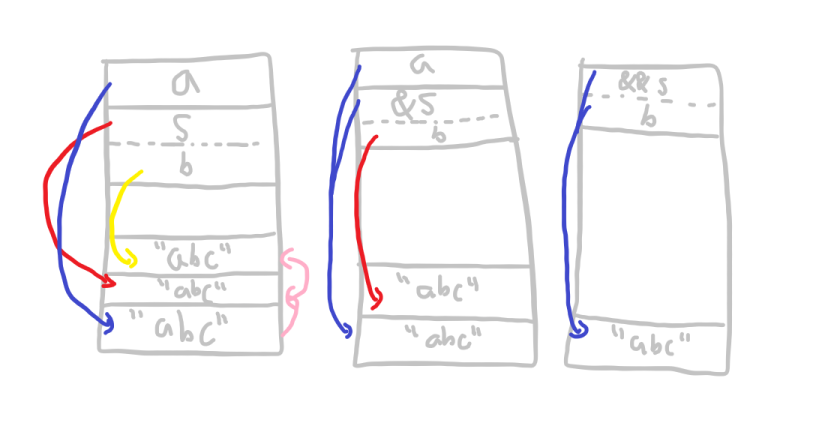 우선 매개변수의 값을 그저 복사한 결과로는 main 함수의 a의 값을 복사해서 매개변수 s를 생성한 것이기 때문에 a와 s의 공간이 모두 메모리에 할당된 상태이다. 여기서 마지막 b의 공간까지 할당하여 값을 복사하였기 때문에 실질적인 데이터 "abc"는 두 번 복사된 것이다.