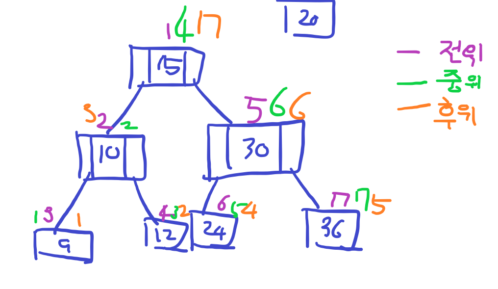 왼쪽 자식 -> 부모 노드 -> 오른쪽 자식 노드의 순서로 탐색되면 중위,