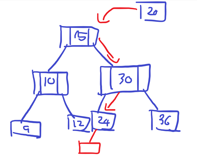 위와 같은 과정으로 데이터 20을 가진 노드는 24를 가진 노드의 왼쪽 자식으로 등록이 된다. 밑에는 데이터를 삽입할 때 사용하는 함수다. 해당 과정을 거쳐서 자동으로 정렬이 된다.