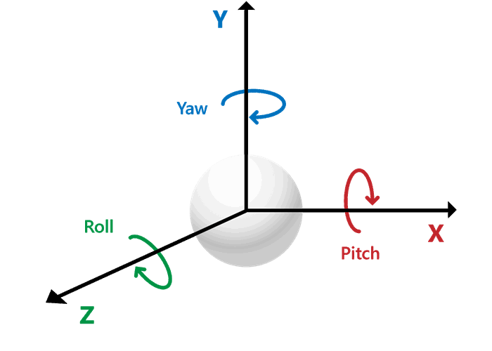 회전은 축을 기준으로 돈다. 3차원 환경에서는 각각 x, y, z의 세 축이 있다. 이 축들을 기준으로 물체가 회전을 하게 되는데 좌표계에 따라 다르지만 D3D에서는 순서대로 y축 기준의 회전을 Yaw, x축 기준의 회전을 Pitch, z축 기준의 회전을 Roll이라고 한다.
