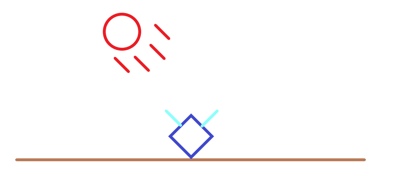 밑의 그림에는 광원과 오브젝트가 있고 붉은색은 광원의 방향, 하늘색은 해당 객체 표면의 법선이다.