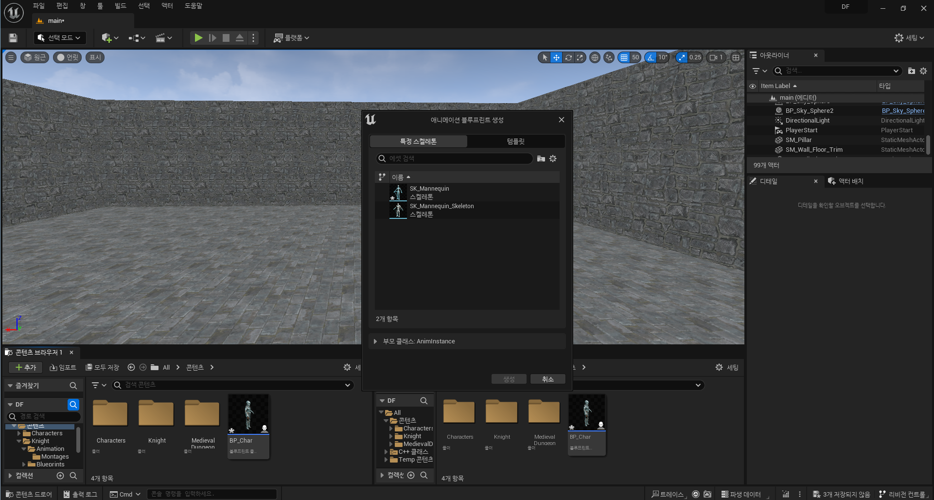 단, 애니메이션을 그냥 사용하면 단일 애니메이션만 사용할 수 있기 때문에, 여러 애니메이션을 사용하려면 별도로 애니메이션 블루프린트를 작성해서 해당 블루프린트를 스켈레탈 메시 컴포넌트에 적용시켜야 한다.