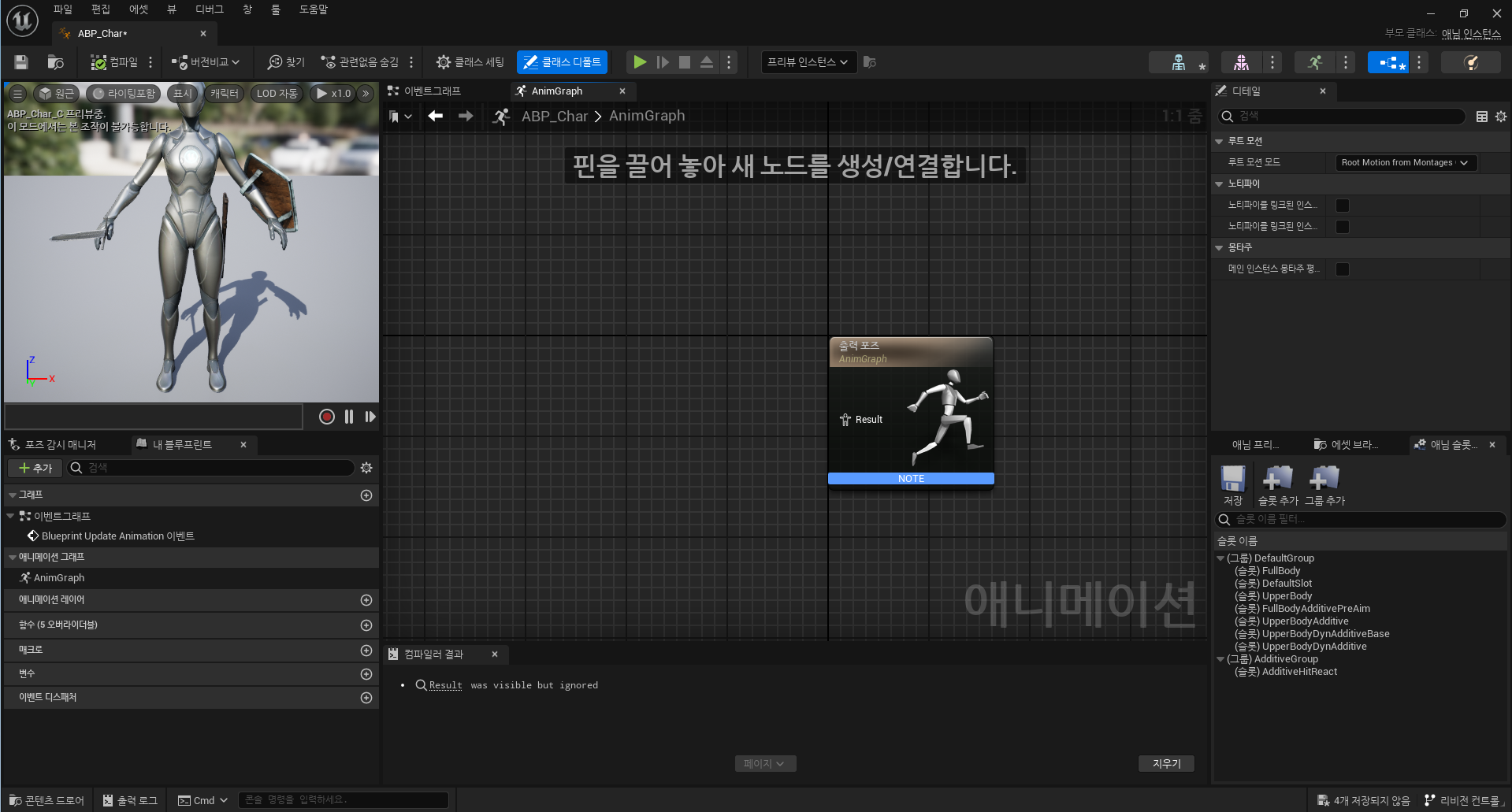 애니메이션 블루프린트를 작성한 뒤, 실행하면 다음과 같은 화면이 나온다. 크게 이벤트그래프와 애님그래프 두 가지의 화면이 탭으로 존재하는데, 이벤트 그래프는 일반적인 블루프린트 클래스와 같다면 애님그래프는 실제 애니메이션의 실행 흐름을 보여주는 그래프이다.