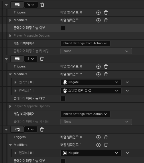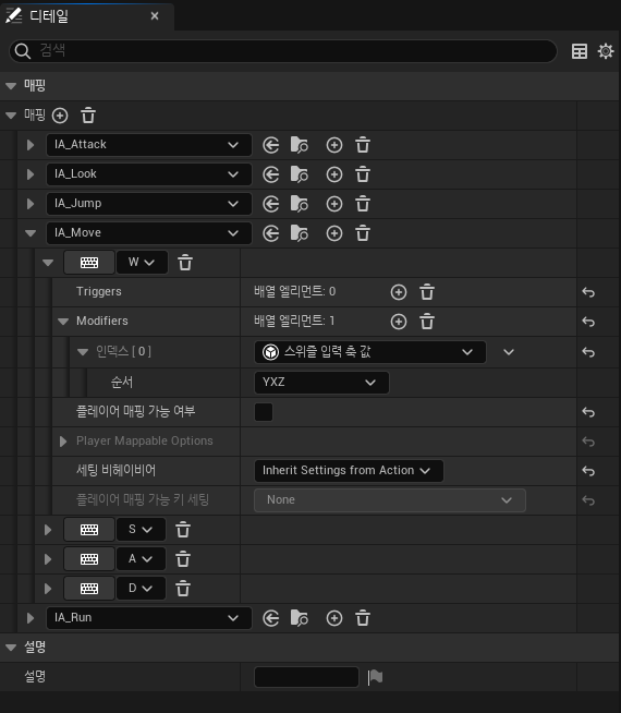 입력 액션에는 아직 키가 바인딩 되어 있지 않다. 단순히 입력 받은 키값에 대한 값을 프로젝트에서 어떻게 인식할 것인지에 대한 설정을 하는 것이 기본이다.