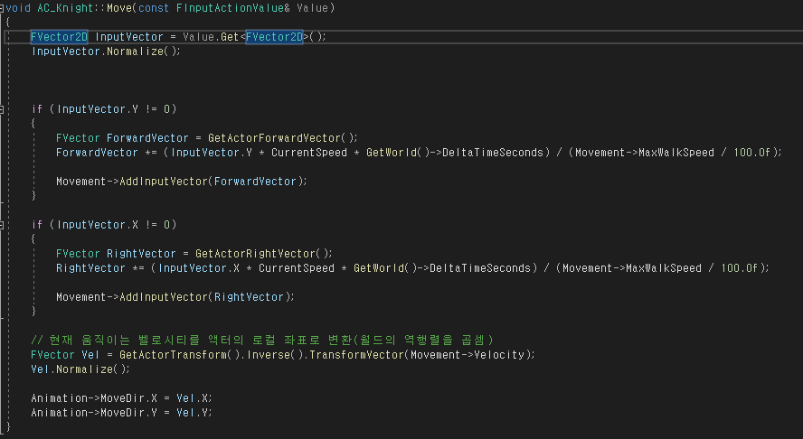 Attack() 함수는 단순 Boolen형의 값이기 때문에 읽어와서 조건문을 통해 공격을 실행하면 되지만 Move() 함수는 FVector2D로 읽어오기로 되어 있어 그 값을 알맞게 사용해야 한다.