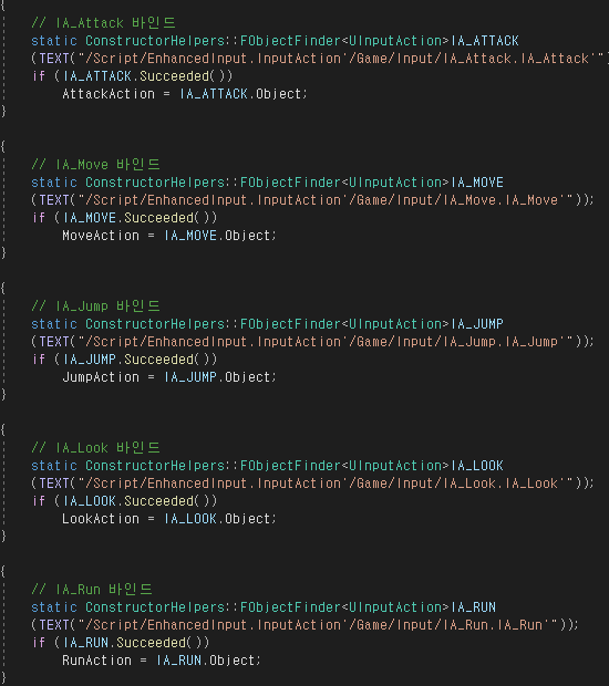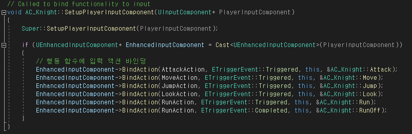 컨텍스트를 먼저 생성하고, 그 다음 각 입력 액션을 바인딩 해주면 준비는 끝난다. 이후에 ACharacter 클래스에서 상속 받은 SetupPlayerInputComponent() 함수에서 각 입력 액션과 실행할 함수를 바인딩 해주면 끝난다.