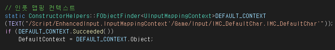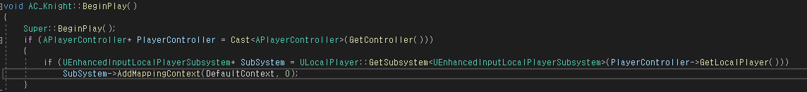 또한 방금 생성한 입력 맵핑 컨텍스트가 이 캐릭터가 가진 컨트롤러에서 사용할 컨텍스트라는 것을 알려주기 위해 BeginPlay() 함수에서 컨트롤러에 컨텍스트를 추가해준다.