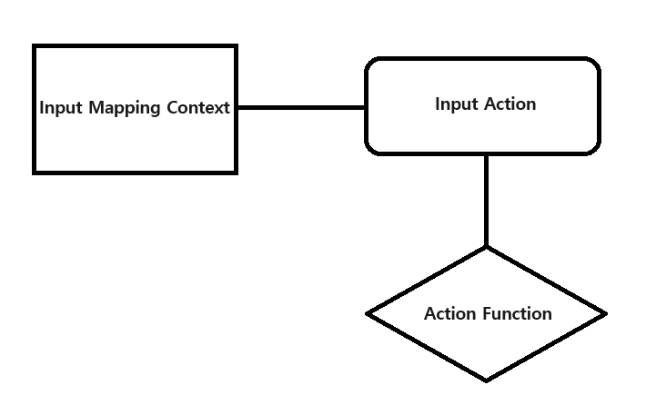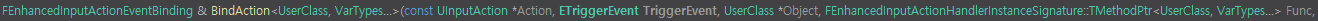 바인딩 할 입력 액션, 트리거 이벤트 타입, 유저 클래스 오브젝트 주소, 이 액션에 바인딩 될 함수가 기본 매개변수이다. 이렇게 하면 입력 맵핑 컨텍스트에서 바인딩 해놓은 키를 입력하면 해당 입력 액션이 연결된 함수가 실행된다.