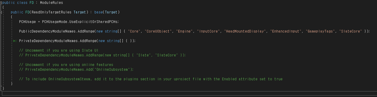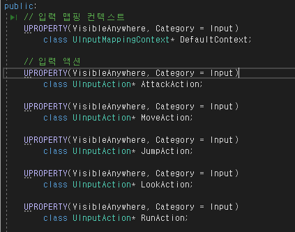 캐릭터 클래스가 가지고 있는 입력 맵핑 컨텍스트 변수와 각각 사용할 입력 액션 변수들이다. 단순히 선언한다고 바로 인식하는 것이 아니라 두 변수를 가져올 수 있는 모듈인 "EnhancedInput"을 먼저 Build.cs에 입력해야 한다.